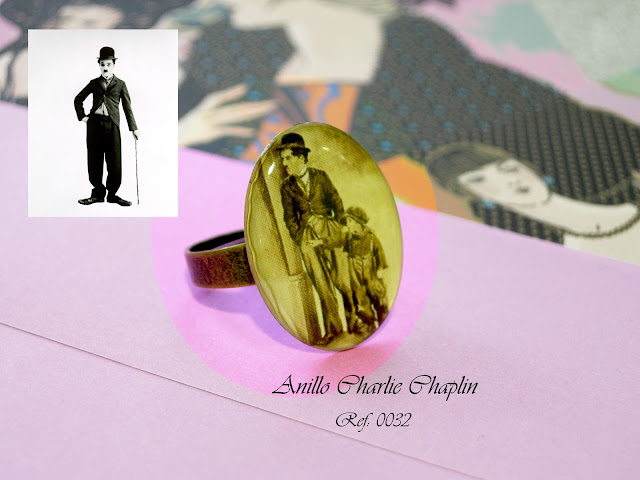 Hemos empezado con anillos con ilustraciones de aquellos maravillosos años, y también con fotos de personajes tan emblemáticos como Audrey Hepburn o Charlot.
